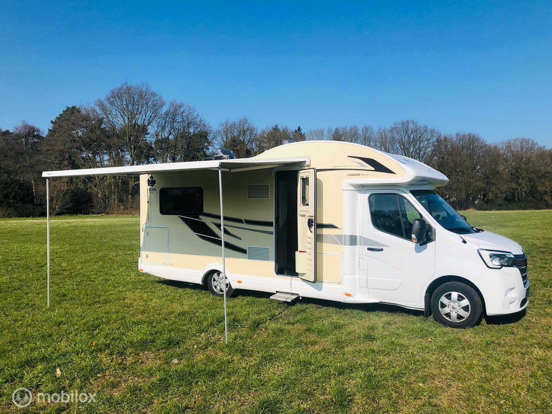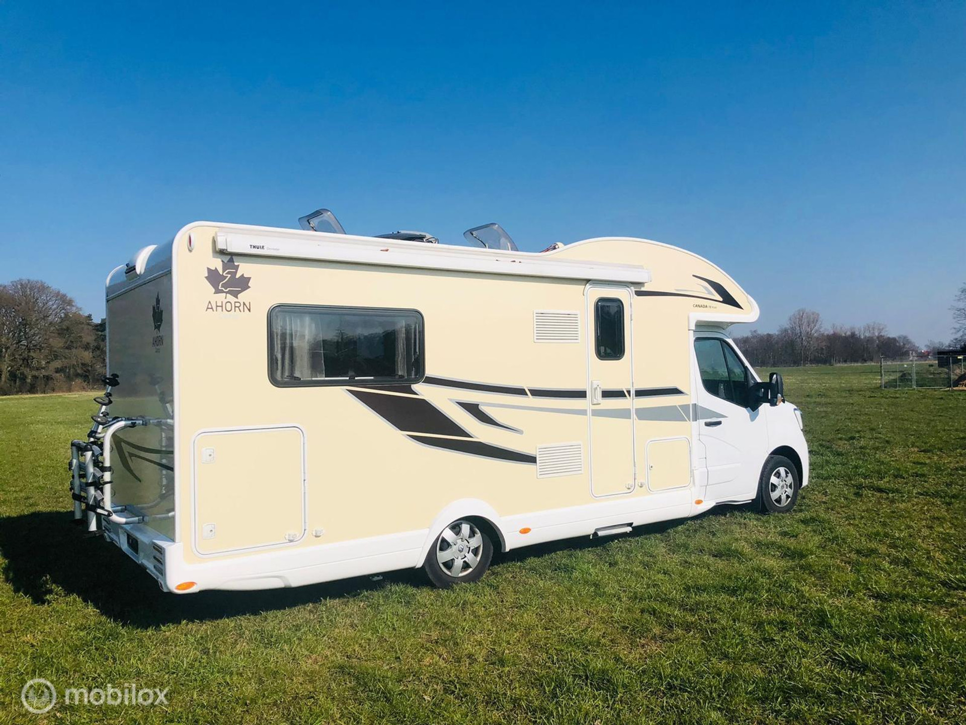 Deze zeer luxe 5-persoons camper Ahorn Canada TE 95 plus is perfect om mee op vakantie te gaan. Tijdens het rijden is de camper voorzien van een airco, cruise control, achteruitrijcamera, navigatie en nog veel meer! Deze half integraal camper bevat 2 lengtebedden, ideaal voor senioren, en een elektrisch 2 persoons hefbed boven de L-zit. De lengtebedden zijn ook om te bouwen in een groot breedte bed. De slaapkamer is voorzien van een deur voor uw privacy. De camper is van alle gemakken voorzien, fijne draaibare stoelen, een aparte douche en aparte toiletruimte, grote XXL koelkast en aparte vriezer. Deze camper is ook voorzien van zonnepanelen waardoor u een aantal dagen zonder aansluiting op het electriciteitsnet kan staan. Als het lekker weer is, kunt u buiten zitten onder een uitdraaibare luifel. Het is ook mogelijk om 3 fietsen of 2 elektrische fietsen mee te nemen, om lekker te gaan fietsen in de omgeving. Voorzieningen: